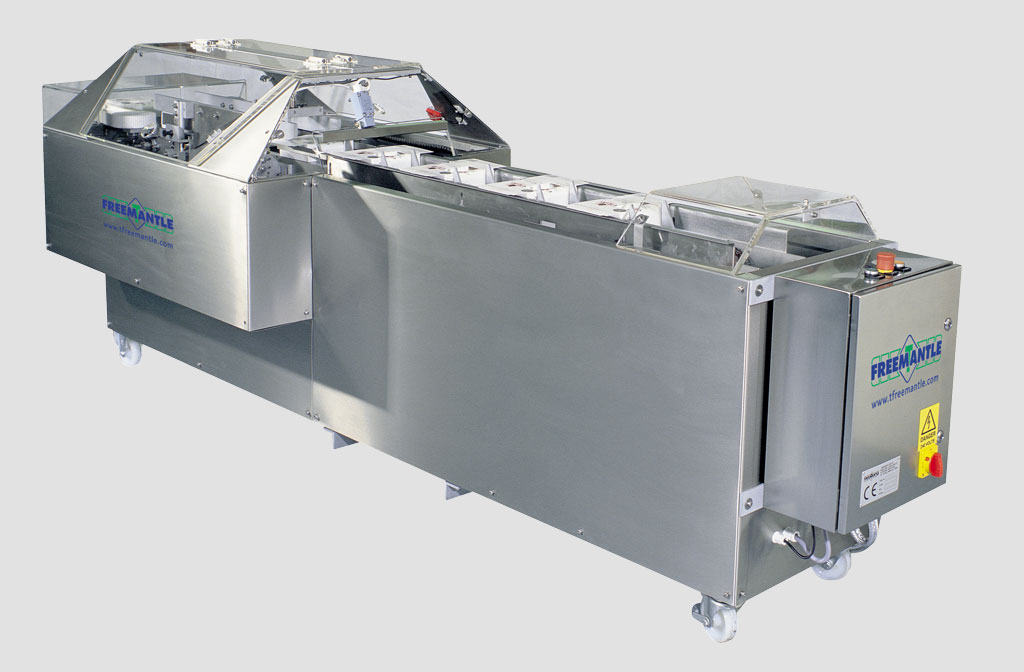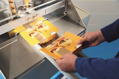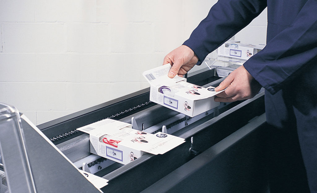 Die Kartons werden manuell befüllt und von Hand in die Maschine geschoben. Die Kartons werden erfasst, mit Heißleim versehen und verschlossen.