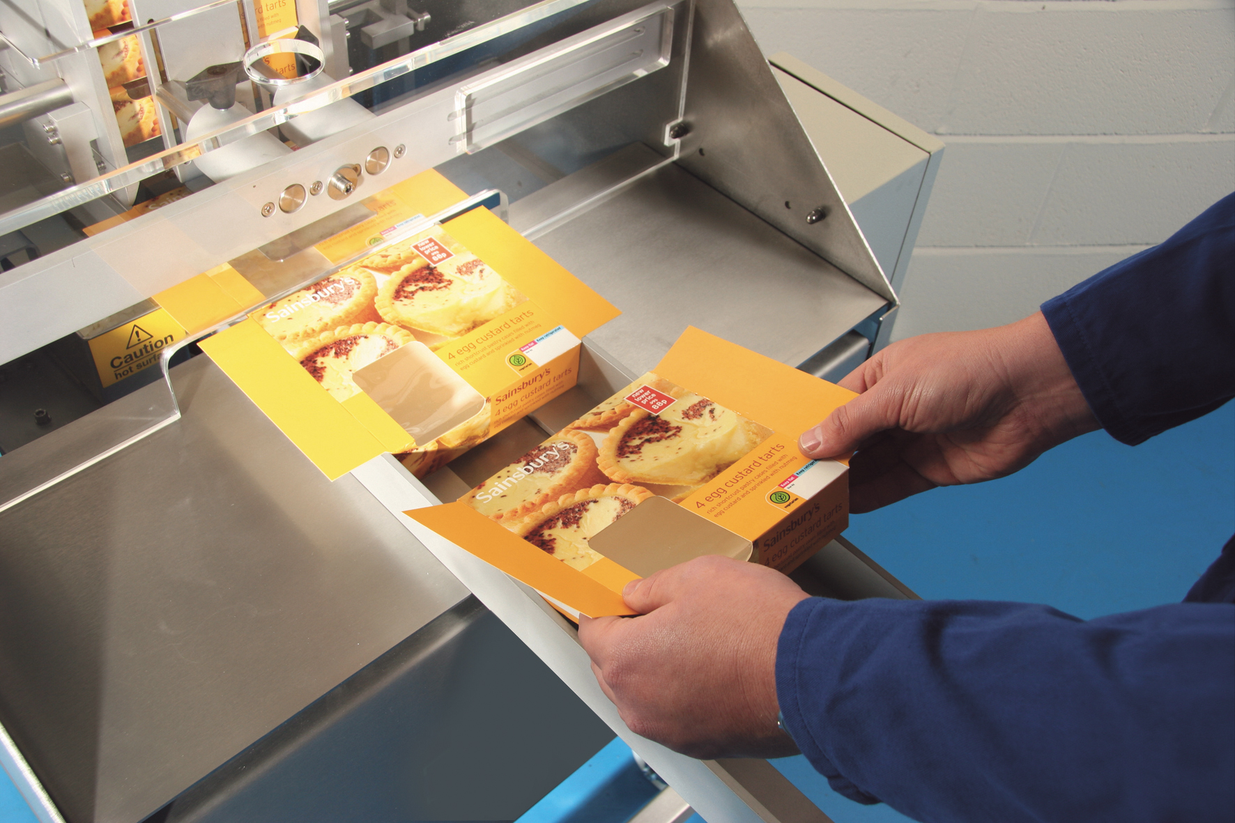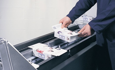 Die Kartons werden manuell befüllt und auf das Einlaufband der Maschine gesetzt. Der Karton wird mit Heißleim versehen und verschlossen. Danach werden die Kartons über ein Auslaufband aus der Maschine befördert.